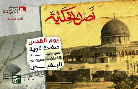 في كل جمعة اخيرة من شهر رمضان، يكون هناك استذكار لأرض عربية مغتصبة، وهي القدس، وفي حقيقة الامر ان هذا اليوم منطلق من حنكة عقائدية بحتة، اطلقها الامام الخميني قدس سره لحكمة هو رائدها، وهذا اليوم لن يمحى حتى تعرف الاجيال ان هناك ارض اغتصبها اليهود، وباعها اهلها، وجلس الاعراب يستمعون لصراخ المغتصبة، وفي شهر العبادة وختامه، يوجد هناك رافضيا جعل لها خندق من ان تنسى، وكأنه يعلم ان هناك يوم سيتصافح الاعراب فيه مع اليهود، خشية من بطش بن ود، هذا لخسة ما ادعوا به من عروبة زائفة، وعنترية فارغة، فباعوا دينهم بثمن بخس.
