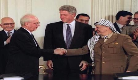 لما ذهب عرفات ( رئيس دولة ) فلسطين لتوقيع برتوكول السلام مع اسرائيل بحضور كلينتون وحسني مبارك والحسين بن طلال (درجة٣٣ في سلّم الماسونية ) فتح ذراعيه وأراد مصافحة رابين بحرارة قائلاً بلسانه اللوذعي المعهود: (كمحاربين قديمين لنتصافح الآن كرجلي سلام) فامتعض رابين ونظر اليه باحتقار وخاطب الحاضرين مستخفاً: (أنظروا الى قاطع الطريق هذا يريد أن يصافحني، هذا الإرهابي يريد أن يساوي نفسه بي )؟!