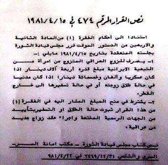 استكمالاً لقرارات التهجير الهمجية؛ أصدر صدام حسين في 15 نيسان 1981 قراره المرقم 474، وهو أغرب قرار تمييزي عنصري في العالم، يعمل على تمزيق الأسرة العراقية، ويحرم الأم من أولادها، إذ يقضي القرار بتطليق الزوج العراقي زوجته العراقية من أصل إيراني، حتى وإن كانت الزوجة تحمل الجنسية العراقية.