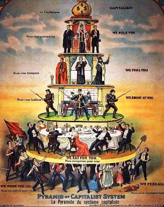 عادة ما يوظف الكاريكاتير الشهير بمسمى "هرم النظام الرأسمالي" الذي نشر مطلع القرن العشرين، في التهكم على الفوارق الطبقية واللامساواة في توزيع الفرص والثروة ، حيث تظهر الأغلبية الفقيرة من العمال في أسفل الهرم وهي تحمل الطبقة البرجوازية على أكتافها ثم تليها علوا طبقة العسكر ورجال الدين ثم المال الذي يعلو الطبقة الحاكمة.
