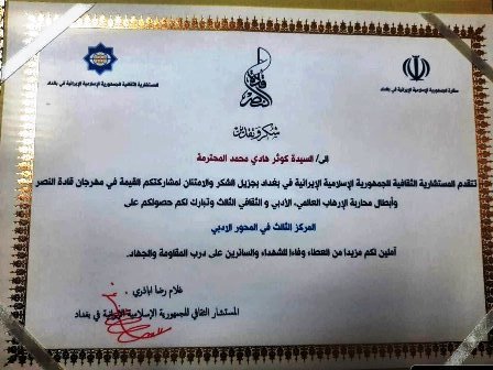 🔹️بعد إعلان الاداره العامة لمهرجان قادة النصر وابطال محاربة الارهاب العالمي الادبي والثقافي الثالث، عن نتائج الفائزين في المهرجان، ضمن حفل بهيج أقامته المستشارية الثقافية الإيرانية حيث قدّموا لي دعوة كوني إحدى المشاركات ضمن المحور الادبي "الخواطر" وقد سبق أن حاز النص على المرتبة الأولى في العام الماضي، وللمرة الثانية يحرز النص على المرتبة الثالثة لهذا العام، وعندما اعتذرت عن الحضور بسبب حضوري عند بيت الله الحرام ضمن وفادة الحجاج لهذا العام، قدموا لي التهنئة بالحج والفوز وسألوني الدعاء، وأرسلوا لي صورة للشهادة ووعدوا بالاحتفاظ بها مع الهدية التذكارية لحين عودتي بأذنه تعالى، فكل الامتنان والشكر الجزيل لكل القائمين على المهرجان ورحم الله شهداءنا قادة النصر، فبفضلهم دخل السرور على نفسي، إذ كان مدعاة إلى ذكرهم في الدعاء رغم أني لم أنسهم ولكن للدعاء وجهًا آخر عند الكعبة المشرفة، ولدولة الفقيه وقائدها وشعبها نصيب وافر من الدعاء في لحظات الانقطاع، أكرر شكري وامتناني لله تعالى ولهم ومَن لم يشكر المخلوق لجميل معروفه لم يشكر الخالق "عزوجل"