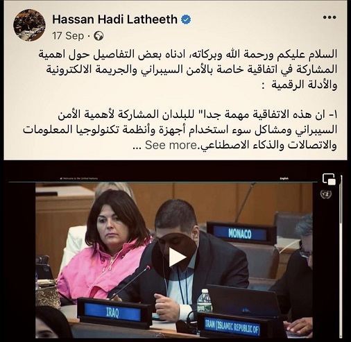 ادناه مشاركته لتمثيل العراق في اجتماع الامم المتحدة لغرض التوقيع على اتفاقية دولية للأمن السيبراني، وقد لاحظ السيد المگصوصي وجود فقرة تُلزم الدول الموقعة بالاعتراف بالجندرة وتوعية الاطفال عليها، وقد سجل ممثلنا اعتراضه وتحفظه على الفقرة مما سبب امتعاض استراليا وبريطانيا وامريكا في الاجتماع .