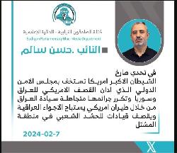 النائب حسن سالم: امريكا تستخف بمجلس الامن الدولي وتكرر جرائمها متجاهلة سيادة العراق