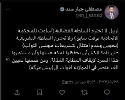 في تغريدة له .... النائب المستقل مصطفى سند : اربيل لا تحترم السلطة القضائية ولا تحترم السلطة التشريعية