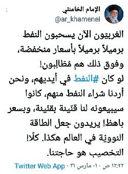 الامام الخامنئي في تغريدة له : لو كان النفط بايديهم كانوا سيبيعونه قنينة بقنينة وبسعر باهض