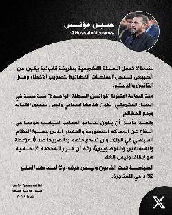 النائب حسين مؤنس يصف المتهجمين على القضاء بالمزعطة والمتملقين والفوضويين