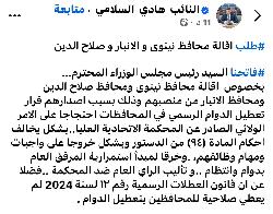 النائب هادي السلامي يفاتح رئيس الوزراء لاقالة محافظي الأنبار ونينوى وصلاح الدين