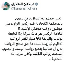 النائب حنان الفتلاوي : رئيس الجمهورية يرفع دعوى قضائية ضد رئيس الوزراء على رواتب موظفي الاقليم وغرامات شركة IQ التابعة لولدك البالغة 911 ملياراً تكفي لرواتبهم