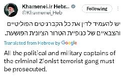 حساب سماحة الامام الخامنئي على منصة x يدعو الى محاكمة كافة القادة السياسيين والعسكريين للعصابة الإرهابية الصهيونية المجرمة