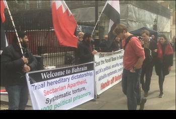 نظم عدد من النشطاء البحرانيين وقفة احتجاجية أمام مقر رئاسة الوزراء البريطانية في لندن بسبب دعم الأخير للنظامين الخليفي والسعودي. وحمل المعتصمون يافطات ترفض تواجد القاعدة الملكية البريطانية في البحرين على حساب أمن المواطنين البحرانيين وحريتهم.