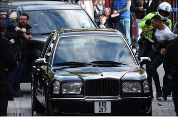 وقالت صحيفة "دايلي ميل" البريطانية، إن أحد المتظاهرين بين الحشود تمكن من الاقتراب من سيارة الليموزين التي يتواجد بداخلها عبر إلقاء نفسه عليها والطرق على نافذتها.. إلا أن الشرطة تمكنت في الغضون من اعتراض المشتبه به وإلقاء القبض عليه، بحسب الصحيفة.