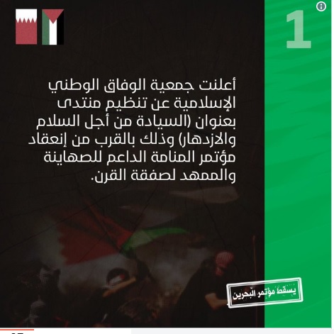 وقالت الجمعية إن المنتدى سيُعقد بمشاركة فلسطينية وعربية، "للتأكيد على الرفض الفلسطيني والعربي والبحريني لمشاريع الارتماء في حضن الصهاينة والمتاجرة بالقضية الفلسطينية، وآخرها مشروع صفقة القرن الذي يشكل زلزالا كبيرا جدا".