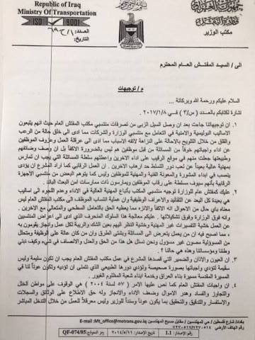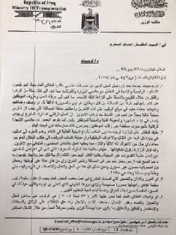 كشفت وثائق رسمية عن مخاطبات جرت بين وزير النقل كاظم فنجان الحمامي والمفتش العام للوزارة بشأن تعامل منتسبي مكتب الأخير مع موظفي الوزارة.