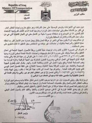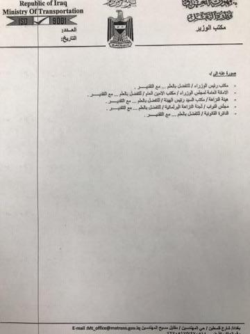 واشار وزير النقل الى أن "وزارتنا وفق رؤيتي كمسؤول اول عن ادارتها بموجب القانون تسعى لخلق علاقة بناءة ومستمرة بين الوزارة ومكتب المفتش العام والعمل وفق مقتضيات المصلحة وليس، كما تصورتم بأنه عملية عرقلة او منع لأعمال التدقيق والتحقيق الخاص بمكتبكم".