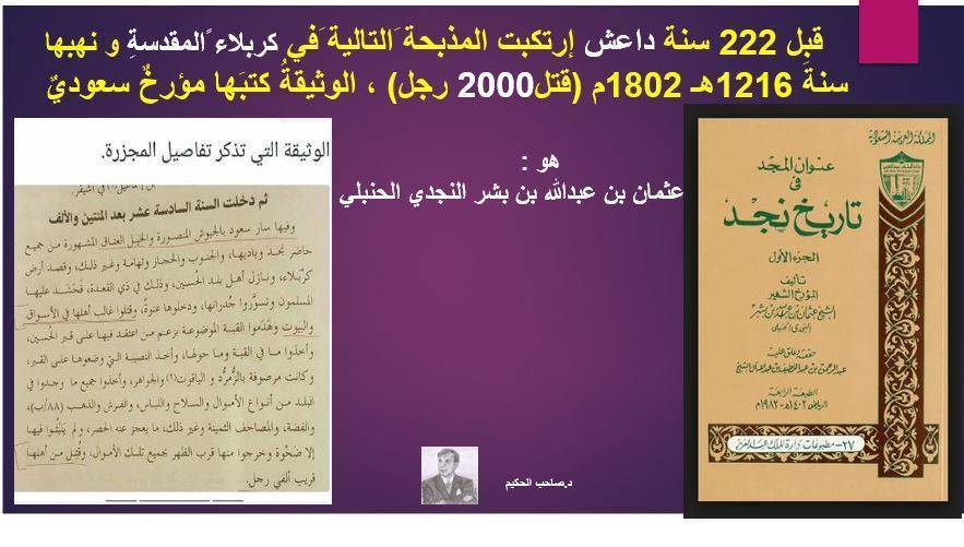 داعش قتل و نهب كربلاء المقدسة قبل 222 سنة ... يقول عثمان بن عبد الله بن بشير النجدي الحنبلي في كتابه المُرفق ، ما يلي :