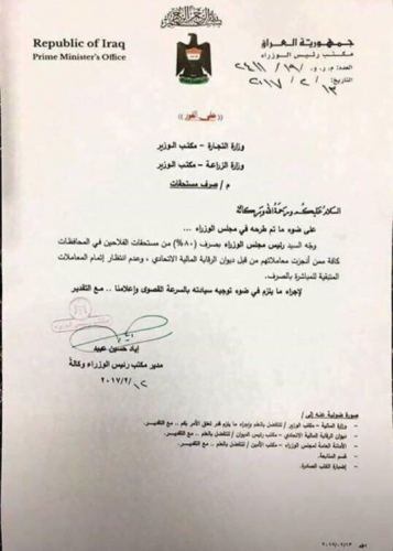 بالوثيقة .. العبادي يوجه بصرف 80 % من مستحقات الفلاحين في كافة المحافظات