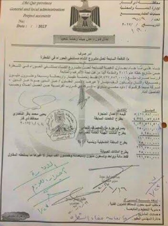 وقال المصدر "، ان "الحكومة المحلية امرت بصرف 5 مليارات و427 مليون و582 الف دينار عراقي لاحد المقاولين المنفذين لمستشفى الحوراء في مدينة الشطرة شمال المحافظة".