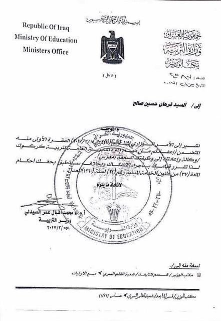 وجاء في الوثيقة الموجهة الى فرحان حسين صالح "نشير الى الامر الوزاري ٤١١١ في الـ15 من شباط 2017، الفقرة الاولى منه المتضمن اعفائكم من مهام المديرية العامة لتربية كركوك وكالة واعادتك الى وظيفتك السابقة (مدرس)".