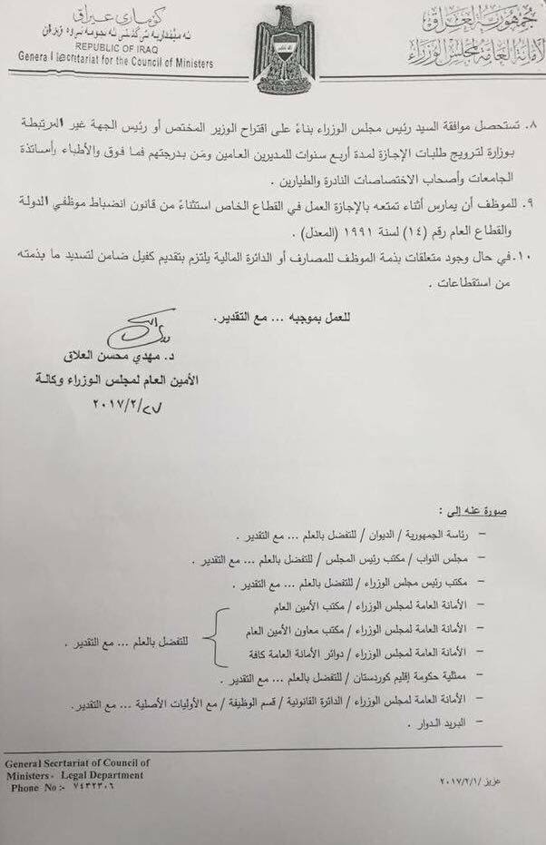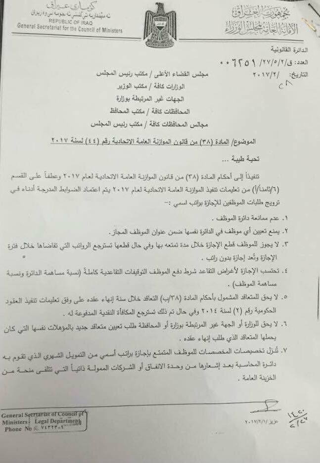 اظهرت وثيقة من الامانة العامة لمجلس الوزراء، تعليمات المادة 38 من قانون الموازنة الاتحادية رقم [44] لسنة 2017 والخاصة بتعليمات الاجازة بالراتب الاسمي.