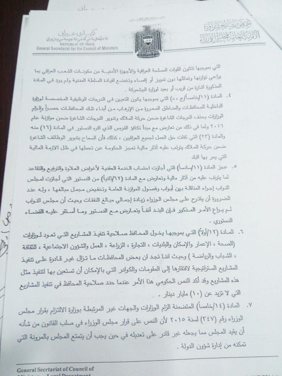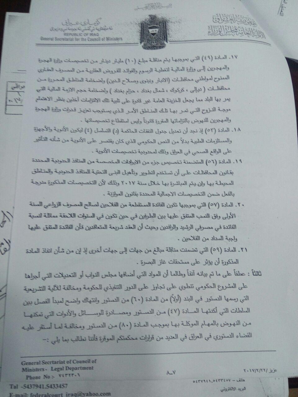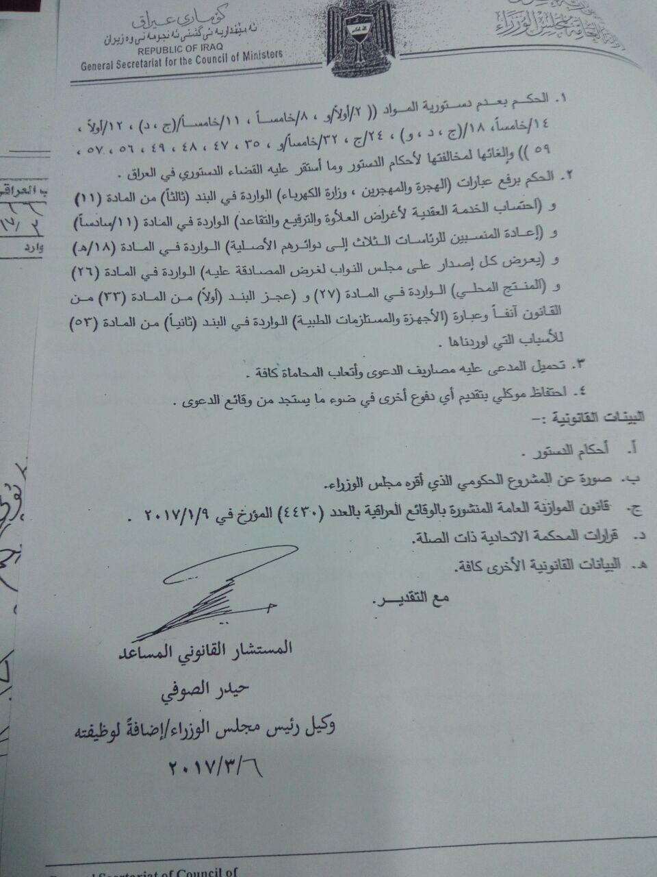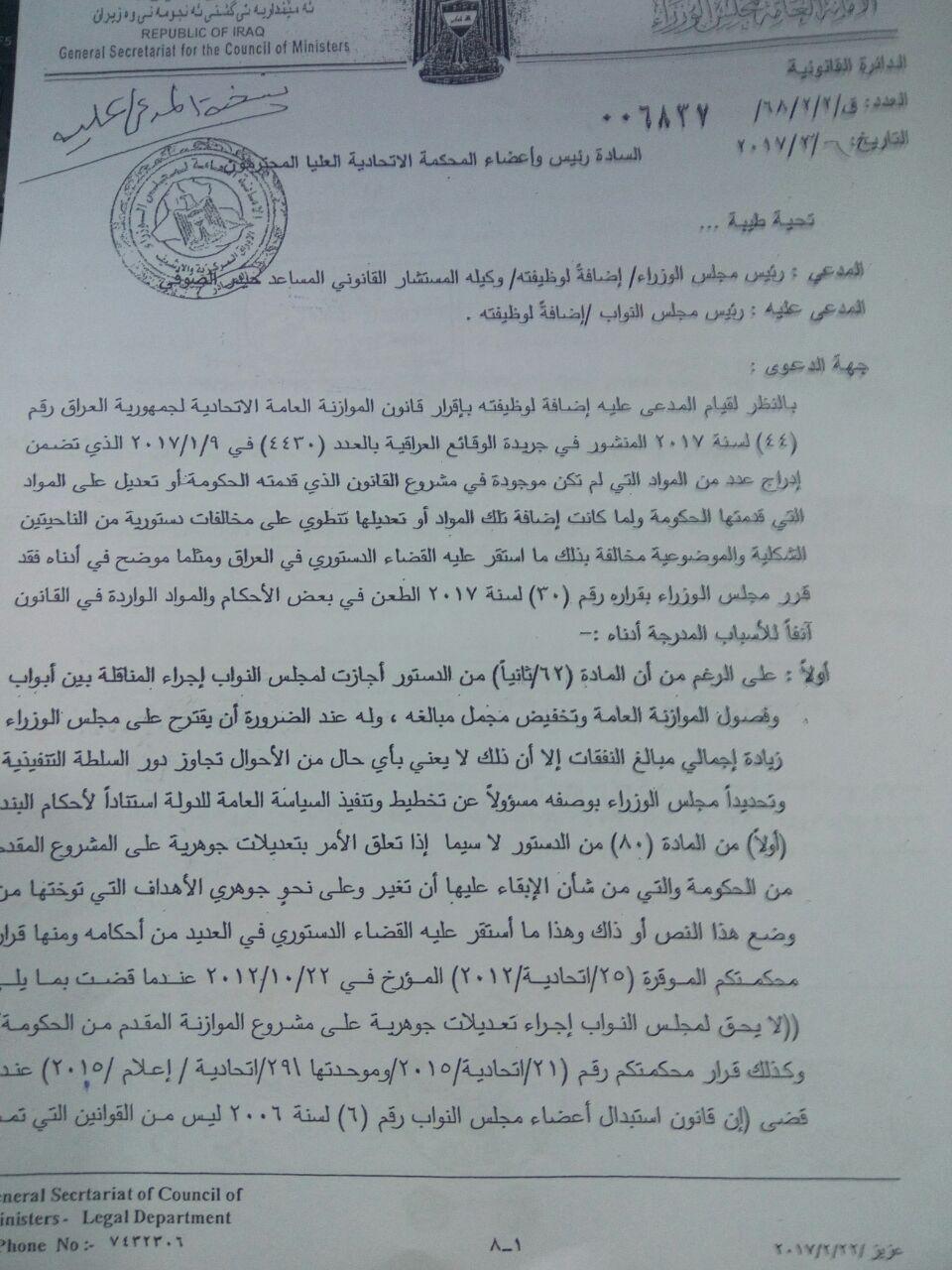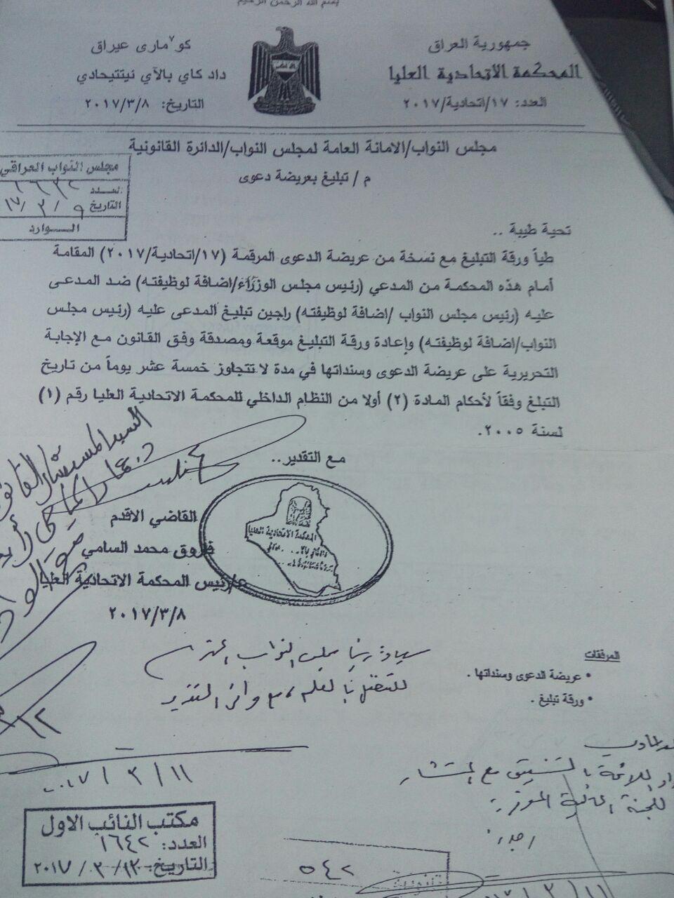 وتضمنت الوثيقة ورقة لتبليغ مع نسخة من عريضة الدعوى المرقمة [17/اتحادية/ 2017]، المقامة امام هذه المحكمة من المدعي عليه [رئيس مجلس الوزراء/ اضافة لوظيفته] على المدعي عليه [رئيس مجلس النواب/ اضافة لوظيفته].