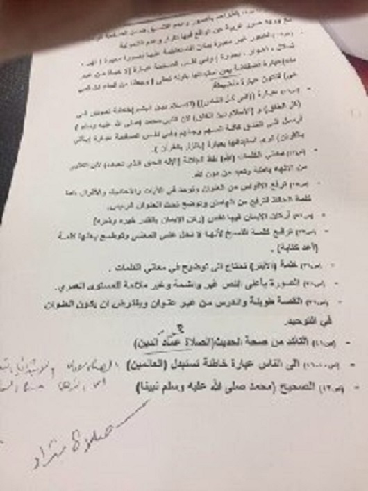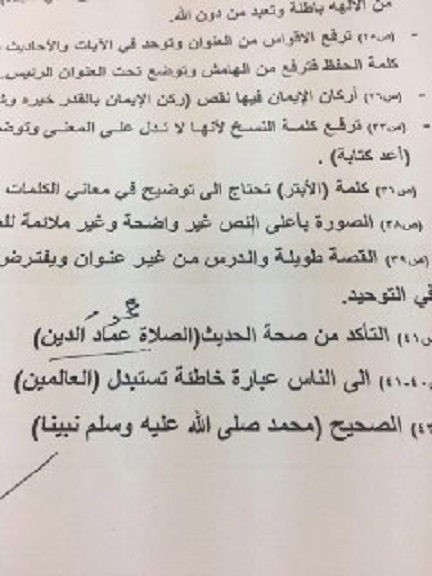 يذكر ان المنهج القديم الذي يدرس قد ذكر جملة ( صلى الله عليه واله وصحبه ) وهي اضافة على النص الرسولي وبدعة واضحة لذلك اعترضت اللجنة وامرت بحذف الال والاصحاب وكان اضافة الاصحاب في الاصل مبيتة لغرض رفع الال لاحقا