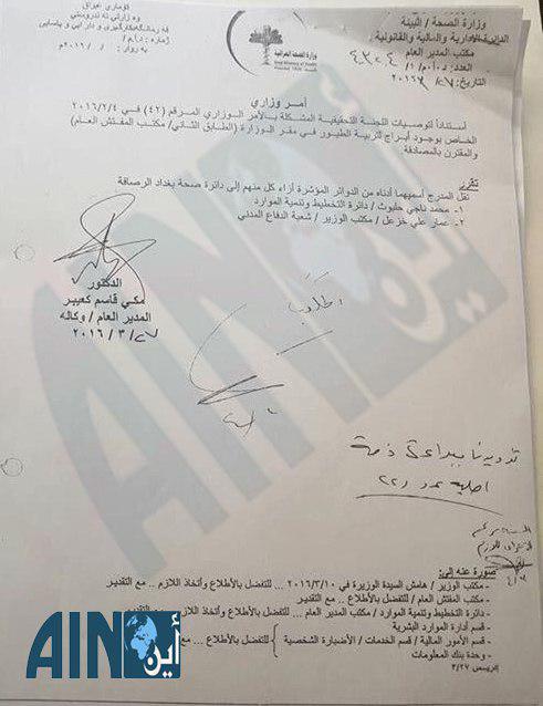 وتقرر تشكيل لجنة تحقيقية برئاسة مدير عام الدائرة الادارية والمالية والقانونية مكي قاسم وكالة، وعضوية ضابط في استخبارات امن الوزارة وحقوقي في مكتب المفتش العام ، وبعد التحقيقات من اللجنة المكلفة تم نقل اثنين من الموظفين في الوزارة الى دائرة صحة بغداد الرصافة.