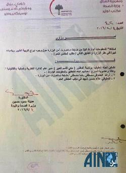 وجاء في الوثيقة "استناداً للمعلومات الواردة إلينا من ضباط استخبارات امن الوزارة حول وجود ابراج تربية الطيور بكميات كبيرة في مقر الوزارة {الطابق الثاني/ مكتب المفتش العام}"، والتي تلاها كتاب لاحق من مكتب المفتش العام يبين ان ابراج الطيور موجودة على سطح مكتب الوزيرة وليس مكتب المفتش العام .
