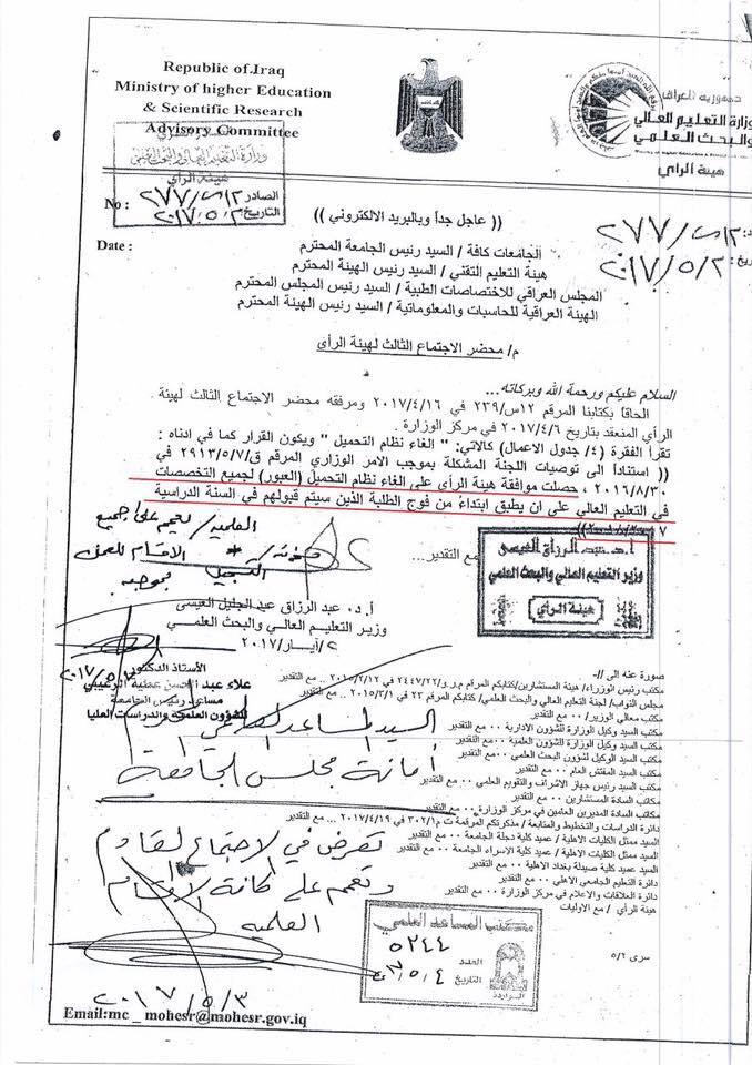 هذه وثيقة صادرة من وزارة التعليم العالي والبحث العلمي تضمنت الغاء نظام التحميل لجميع التخصصات ابتداء من العام الدراسي 2017- 2018.