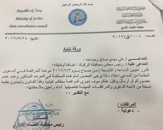 وبحسب نسخة من التبليغ المؤرخ في 28 أيار 2017، والذي حدد الساعة التاسعة من صباح يوم 3 تموز 2017 موعدا للمرافعة في الدعوى التي رفعها كل من علي مهدي صادق وتركان شكر أيوب وقاسم حمزة أحمد وتحسين محمد علي ولي وعدنان نور الدين محمد، وجميعهم أعضاء تركمان في مجلس محافظة كركوك.
