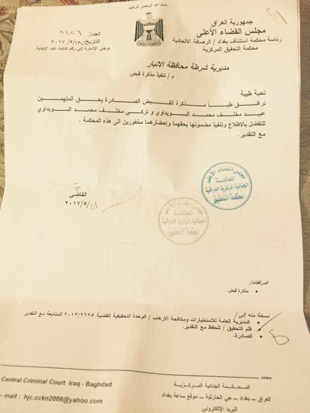 بالوثيقة.. صدور مذكرة بحق عضو في مجلس الانبار وشقيقه