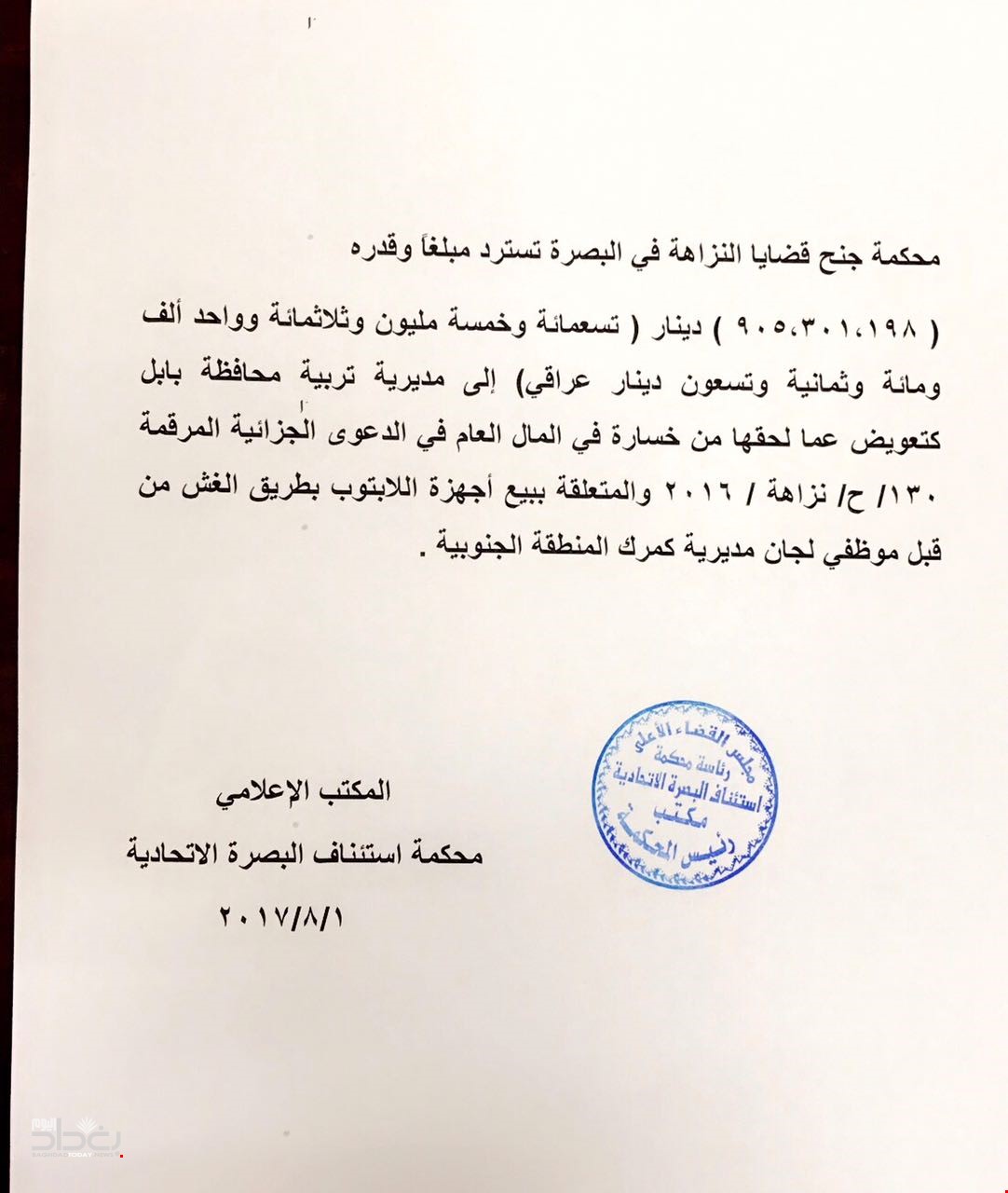 وأشارت الوثيقة الى ان "محكمة جنح قضايا النزاهة في البصرة تسترد مبلغا قدره 905301198 دينار (تسعمائة وخمسة مليون وثلاثمائة وواحد الف ومائة وثمانية وتسعون دينار عراقي) الى مديرية تربيةمحافظة بابل كتعويض عما لحقها من خسارة في المال العام في الدعوى الجزائية المرقمة 130/ح/نزاهة/2016 والمتعلقة ببيع أجهزة اللابتوب بطريق الغش من قبل موظفي لجان مديرية كمرك المنطقة الجنوبية".