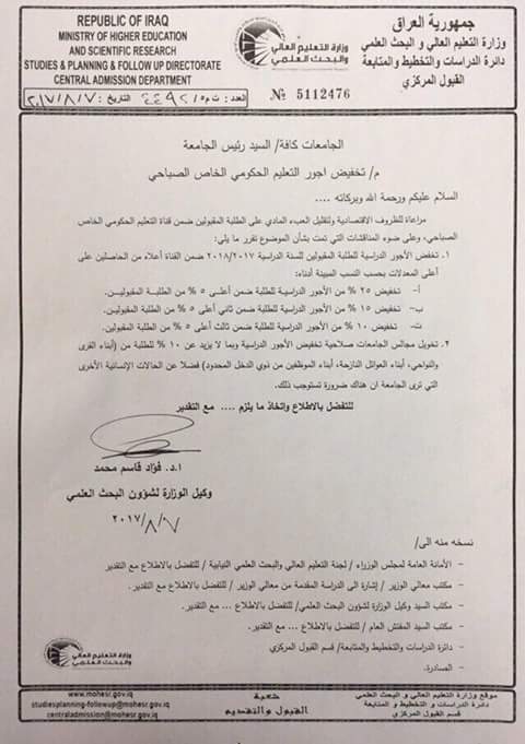 أعلنت عضو لجنة التعليم العالي البرلمانية النائبة غيداء كمبش، الاربعاء، عن موافقة وزارة التعليم العالي والبحث العلمي على تخفيض اجور دراسة التعليم الخاص الحكومي (الموازي).