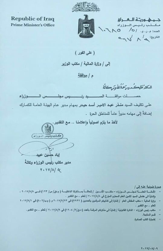 وجاء في الكتاب الصادر اليوم، من مكتب رئيس الوزراء والموجه الى مكتب وزير المالية انه "حصلت موافقة رئيس مجلس الوزراء على تكليف منذر عبد الامير اسد حيدر بمهام مدير عام الهيئة العامة للجمارك اضافة الى مهامه مديرا عاما للمناطق الحرة".