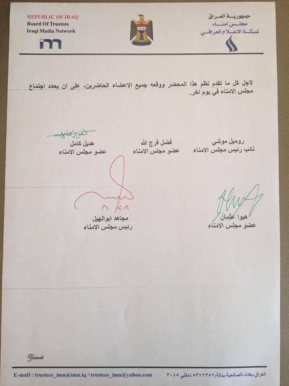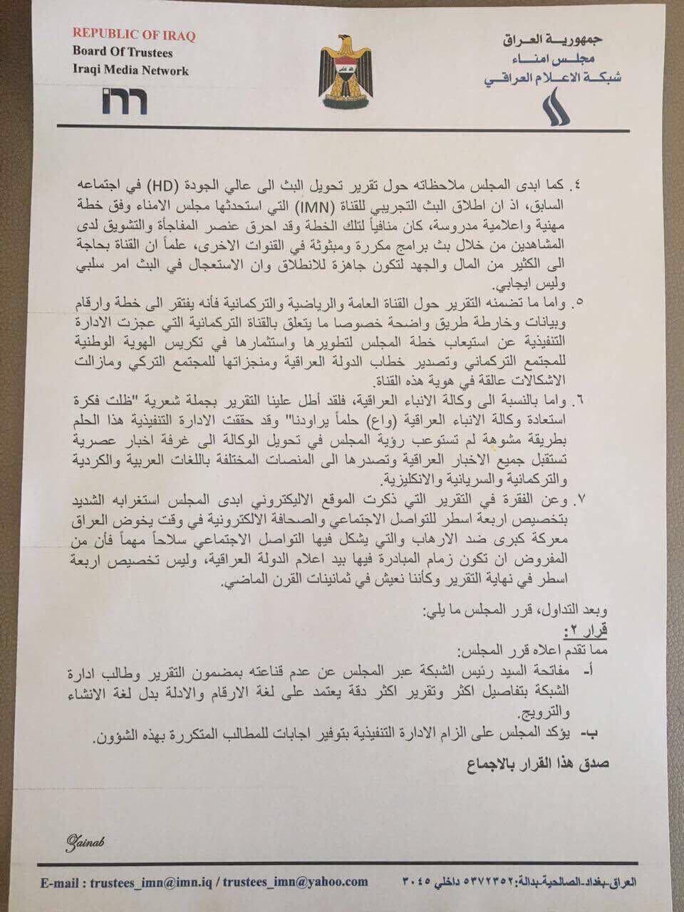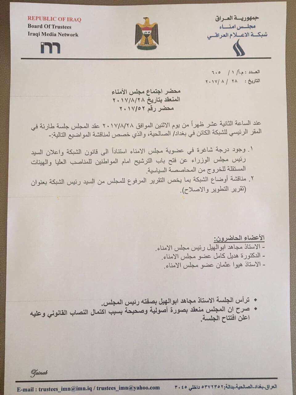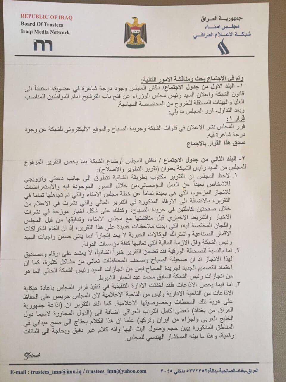 ووفق محضر لجلسة طارئة عقدها مجلس الأمناء المنعقد في 28 آب الجاري ببغداد خصصت لمناقشة وجود درجة شاغرة في في عضوية المجلس، وأوضاع الشبكة بما يخص التقرير المرفوع له من رئيس شبكة الاعلام علي الشلاه بعنوان [تقرير التطوير والاصلاح] فقد انتقد المجلس هذا التقرير وفند ما جاء فيه.