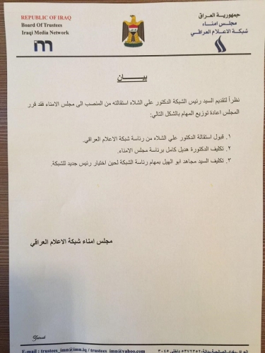 وذكر المجلس في بيان اليوم انه" تم قبول استقالة علي الشلاه من رئاسة شبكة الاعلام العراقي وتكليف مجاهد ابو الهيل لرئاسة الشبكة لحين اختيار رئيس جديد للشبكة ".