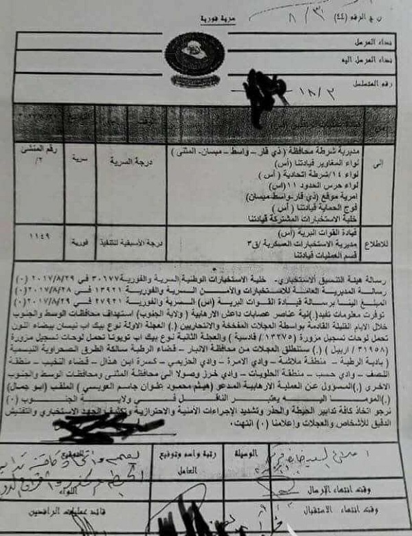 كشفت وثيقة مسربة تحمل توقيع قائد عمليات الرافدين، وجهت إلى التشكيلات الأمنية في محافظات الوسط والجنوب، تفيد بعزم داعش إستهداف محافظات (ذي قار والمثنى وواسط وميسان)، بواسطة عجلات مفخخة وانتحاريين.
