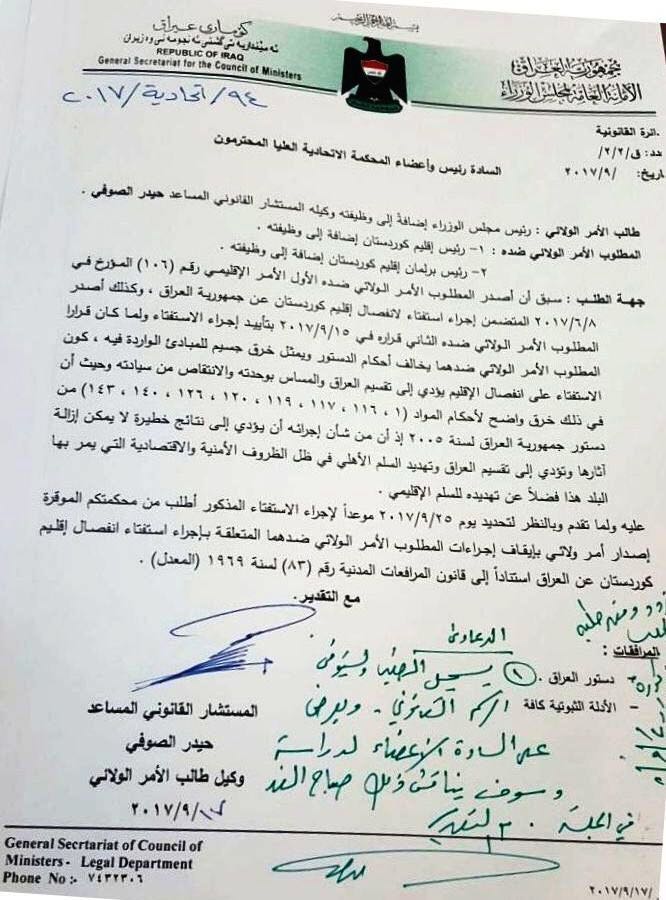 وذكر بيان للمكتب ان العبادي "وجه طلباً الى المحكمة الاتحادية بشأن عدم دستورية اجراء انفصال اي اقليم او محافظة عن العراق، وكذلك اصدار أمر ولائي بايقاف اجراءات استفتاء انفصال اقليم كردستان".
