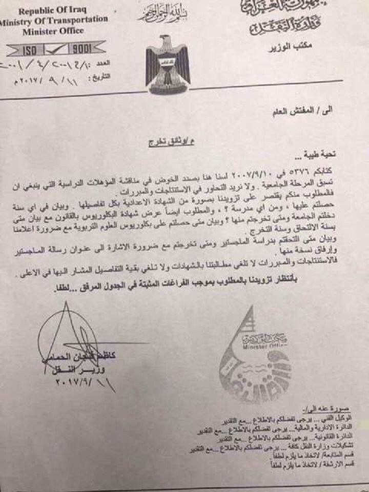 طالب وزير النقل "كاظم فنجان الحمامي"، اليوم الثلاثاء، المفتش العام الخاص بالوزارة تزويد الوزارة بشهاداته الدراسية.