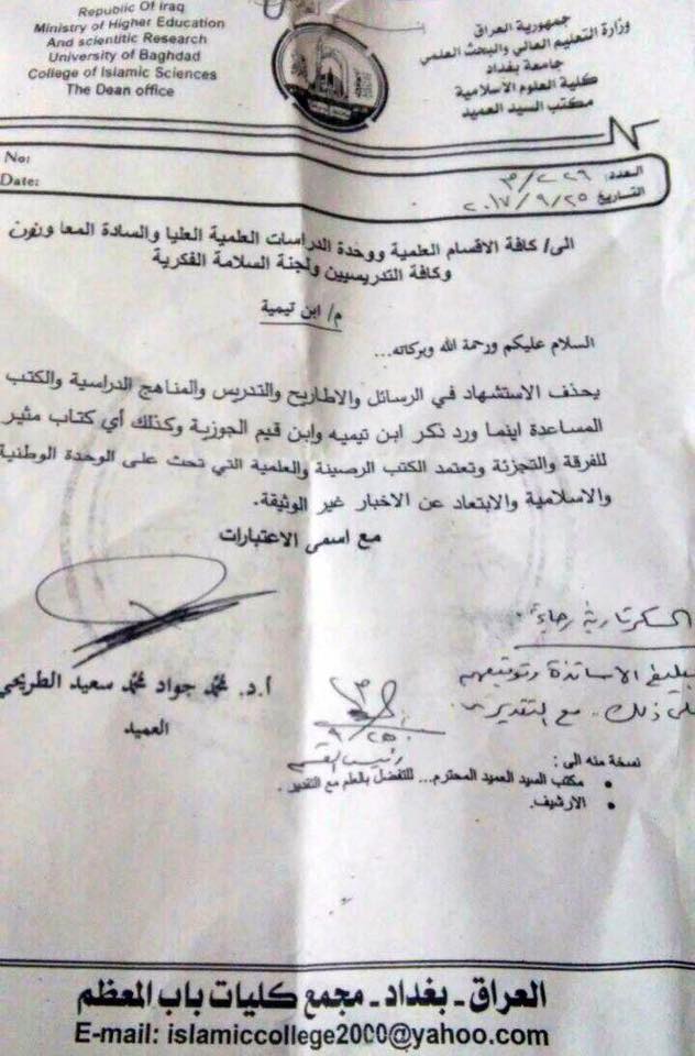 ووفق الأمر الإداري الصادر من عميد الكلية الى كافة الاقسام العلمية ووحدة الدراسات العلمية العليا والمعاونين وكافة التدريسيين ولجنة السلامة الفكرية فأنه "يحذف الاستشهاد في الرسائل والاطاريح والتدريس والمناهج الدراسية والكتب المساعدة أينما ورد ذكر [أبن تيمية] و[أبن قيم الجوزية] وكذلك أي كتاب مثير للفرقة والتجزئة وتعتمد الكتب الرصينة والعلمية التي تحث على الوحدة الوطنية والاسلامية والابتعاد عن الاخبار غير الوثيقة".