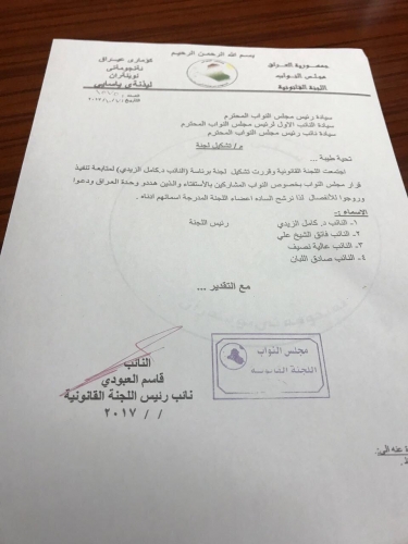 وجاء في الوثيقة اليوم انه " تم ترشيح اربعة نواب لمتابعة تنفيذ القرار وهم كل من [كامل الزيدي ، فائق الشيخ علي ، عالية نصيف ، صادق اللبان] ".