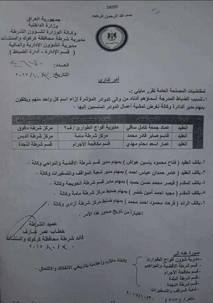وجاء في وثيقة صادرة من القيادة تبين تفاصيل تلك التغييرات ابرزها تسمية مدير شرطة قضاء الحويجة فتاح الخفاجي كمدير لشرطة الاقضية والنواحي وكالة.