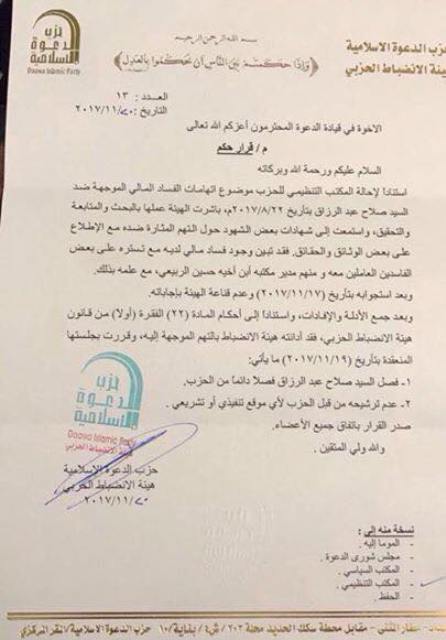 كما تضمنت الوثيقة ايضا عدم ترشيح عبد الرزاق من قبل الحزب لاي موقع تنفيذي او تشريعي.