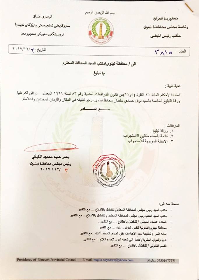 وقال عضو مجلس نينوى علي خضير في تصريح صحفي، ان مجلس محافظة نينوى أبلغ العاكوب لحضور جلسة استجوابه يوم الاثنين المقبل 11-12-2017 في مقر المجلس بمدينة الموصل.