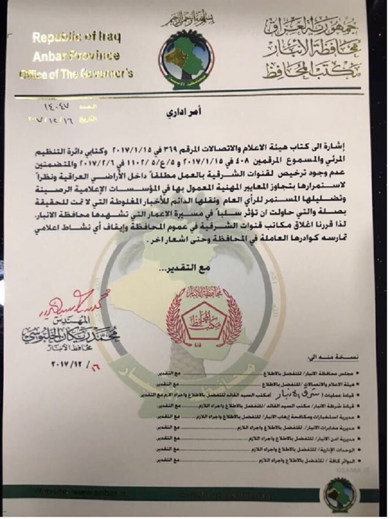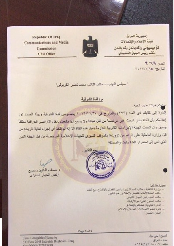 وبحسب الوثائق فان دائرة تنظيم المرئي والمسموع اصدرت كتابا بتاريخ السابع من شباط الماضي الى مكتب وزير الداخلية لبيان موقف بث قناة الشرقية التي وبحسب الكتاب غير مرخصة للعمل ولايسمح لها بالعمل داخل الاراضي العراقية.