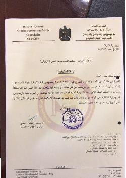 وثائق صادرة من هيئة الاتصالات ودائرة التنظيم المرئي والمسموع الخاصة بايقاف عمل قناة الشرقية في عموم مناطق البلاد.