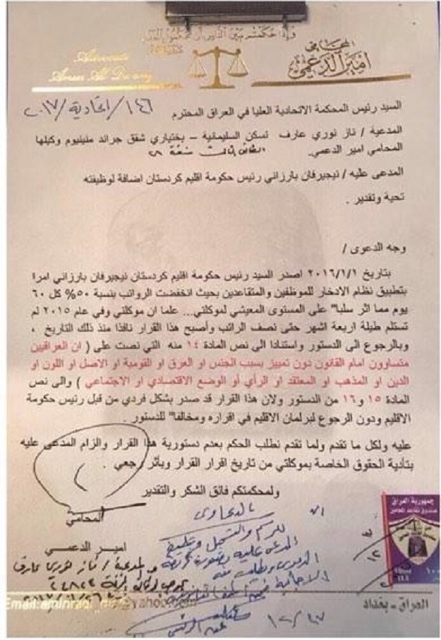 نشرت وثيقة اليوم الأربعاء، على وثيقة مقدمة من المحامي أمير الدعمي، وهو وكيل للمدعية ناز نوري عارف، ومرسلة إلى المحكمة الاتحادية، تشكو فيها رئيس حكومة كردستان نيجيرفان بارزاني، بسبب نظام ادخار رواتب موظفي الإقليم، معتبرة الأمر مخالف للدستور.
