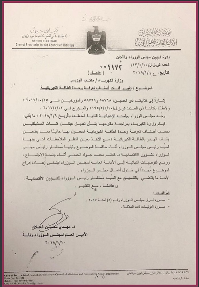 وجاء في الوثيقة، أن مجلس الوزراء، وجه بجلسته الاعتيادية الثانية المنعقدة بتاريخ ٩/١/٢٠١٨، قيام وزارة الكهرباء بمراجعة مقترحاتها بشأن تعديل هيكل فئات المستهلكين بحسب أصناف تعرفة وحدة الطاقة الكهربائية المعمول بها حالياً، بما يضمن إيقاف هدر الطاقة الكهربائية.
