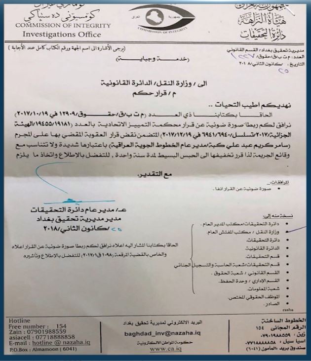 أصدرت هيئة النزاهة دائرة التحقيقات قرارا يقضي بتخفيف عقوبة مدير عام الخطوط الجوية العراقية الى الحبس لسنة واحدة.