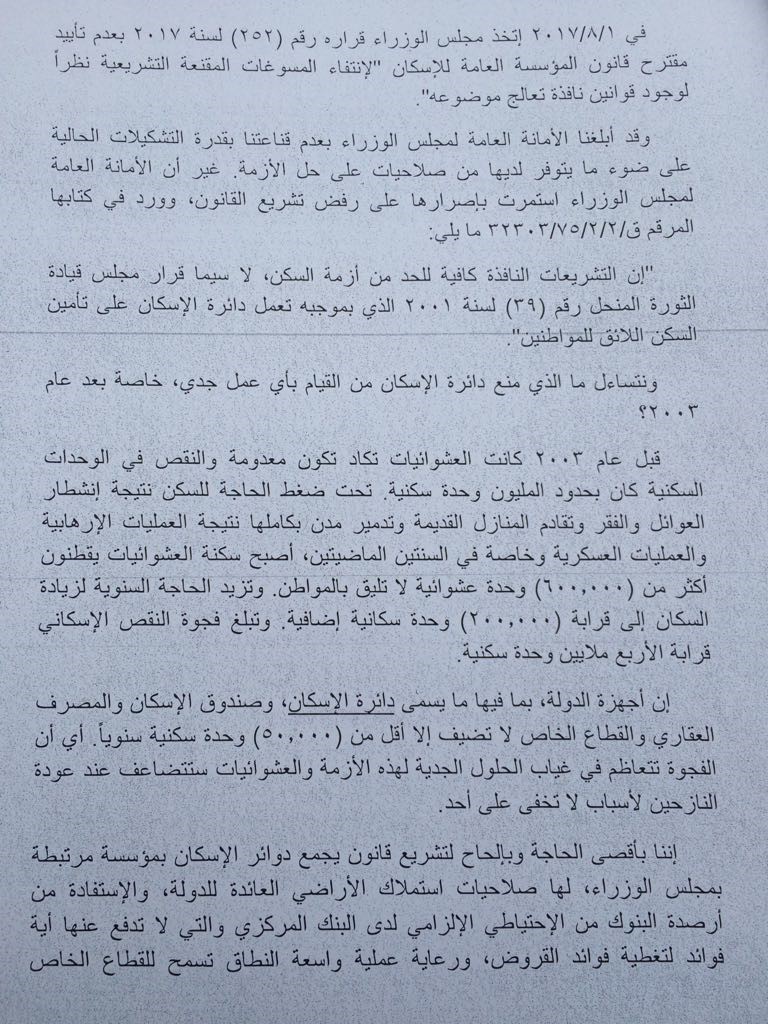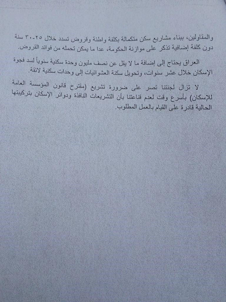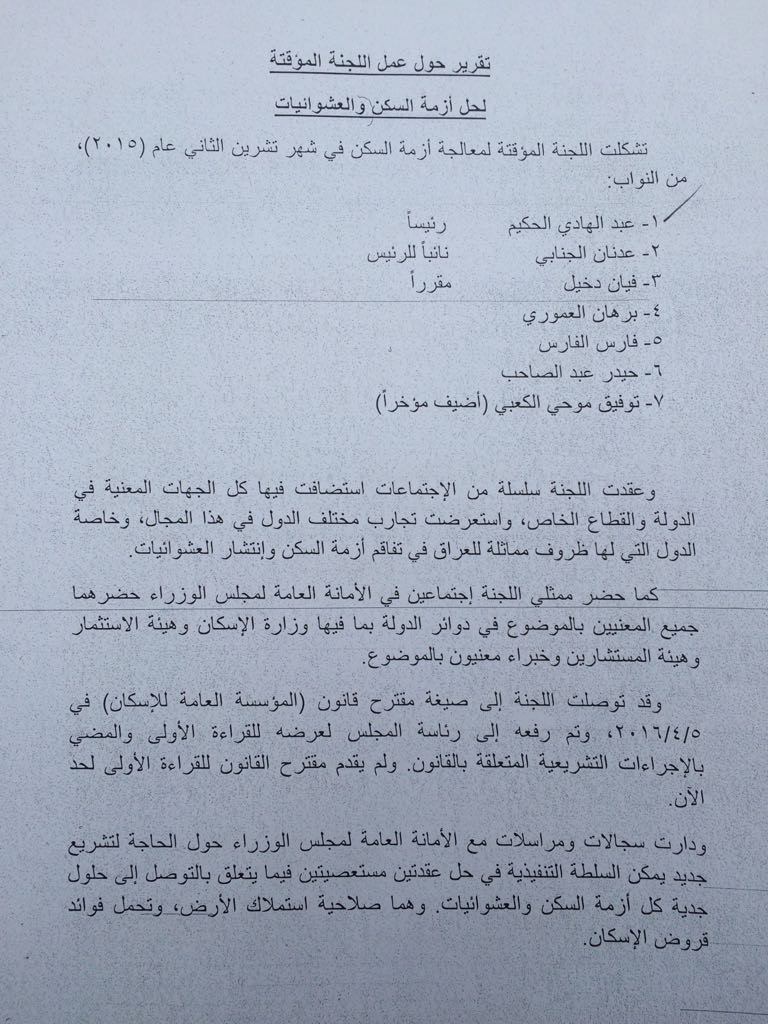 ادناه خلاصة تقرير اللجنة النيابية لحل أزمة السكن المناقش في الجلسة رقم 10 لمجلس النواب في 5/2/ 2018