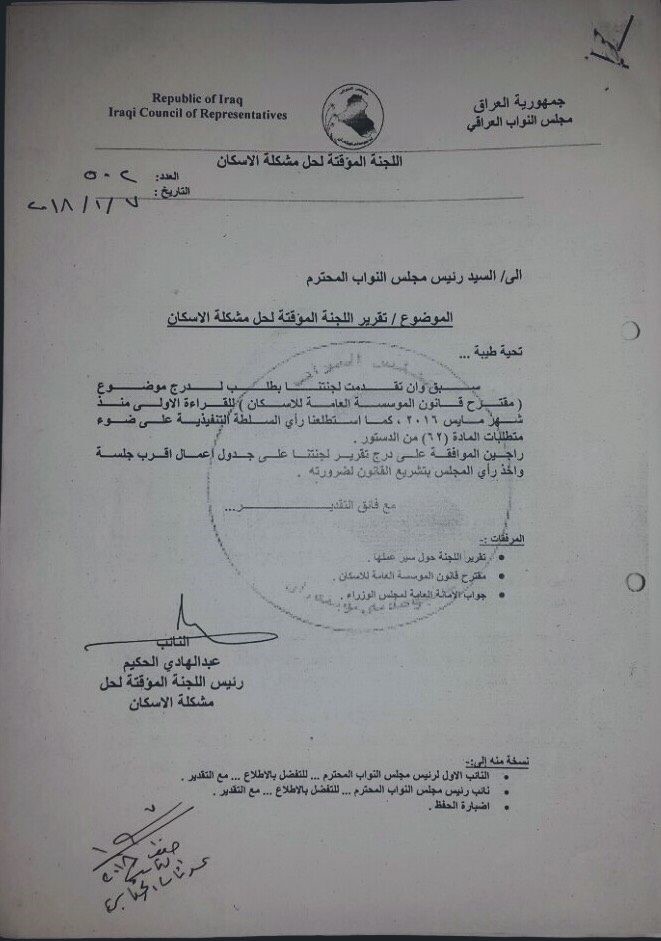 حصلت وكالة انباء براثا على وثائق تبين خلاصة تقرير اللجنة النيابية لحل ازمة السكن برئاسة النائب المستقل السيد عبد الهادي الحكيم والتي نوقشت في الجلسة رقم 10 لمجلس النواب في 5/2/ 2018